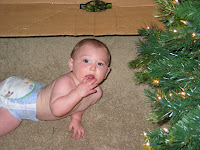 Who me? No, Mommy, of course I am not about to grab the Christmas tree in my naked glory or attempt to play with the cord. I would never do a dangerous thing like that!