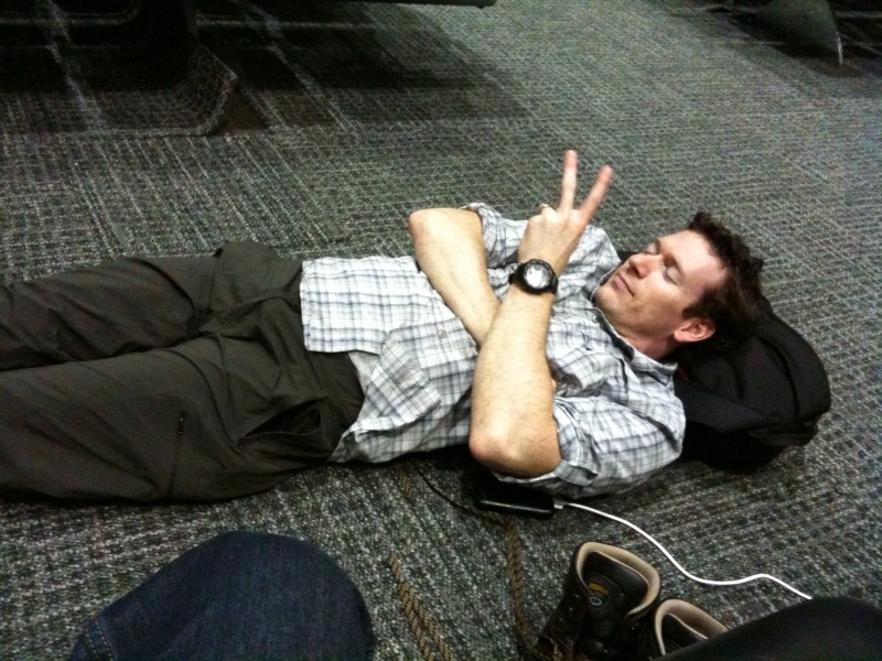 Here is a photo of my super stud world traveling husband in the airport snapped by his pal as they endured an 11 hour layover… This is so the epitome of his personality – laid back, listening to good music, trying to take a nap.