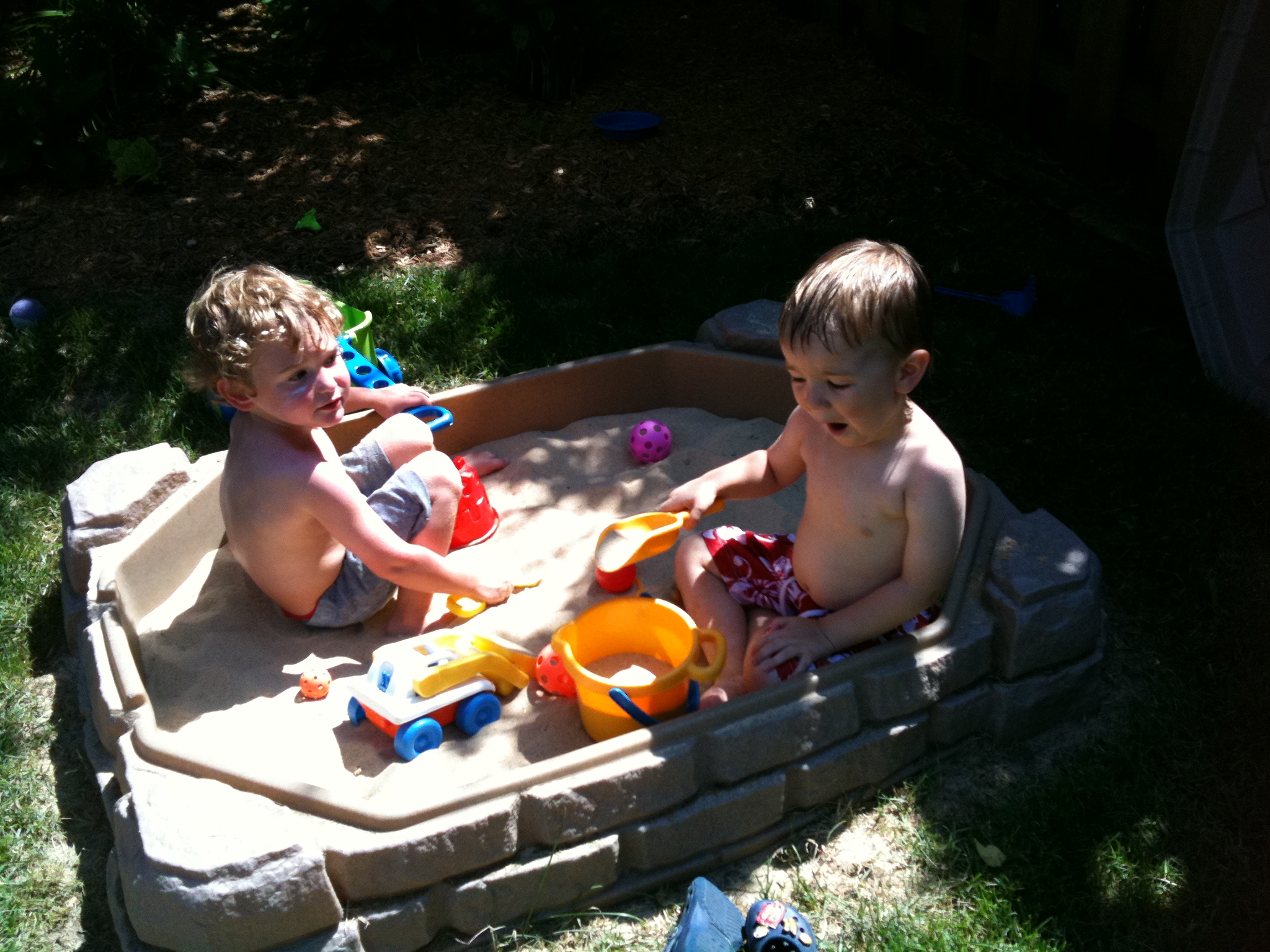 15. Two best buds playing in the sandbox on a hot day.
