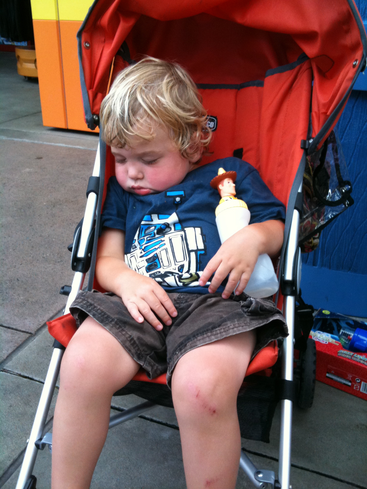 After the Hoopty-Doo was over, we had to take a boat back to the Magic Kingdom. Upon our arrival, JJ needed to take a quick break while I waited with the stroller brigade.