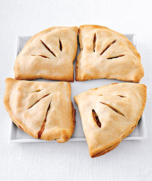 Cut each piecrust in half to form 4 half-circles. Spoon the chicken mixture over the bottom-half of each half-circle, leaving a 1/2 inch border. Using your fingers, wet the border with water. Fold the top of each crust over the chicken to form a quarter-circle. Press to seal. Make three 1 inch slits in each top crust. (I used a fork to seal the edges because it looked pretty…:))