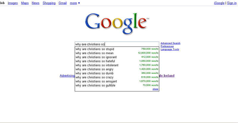 The following words automatically pop-up when you type “Why are Christians so” in the Google search bar: stupid, mean, ignorant, hateful, intolerant, angry, dumb, crazy, arrogant, and gullible.