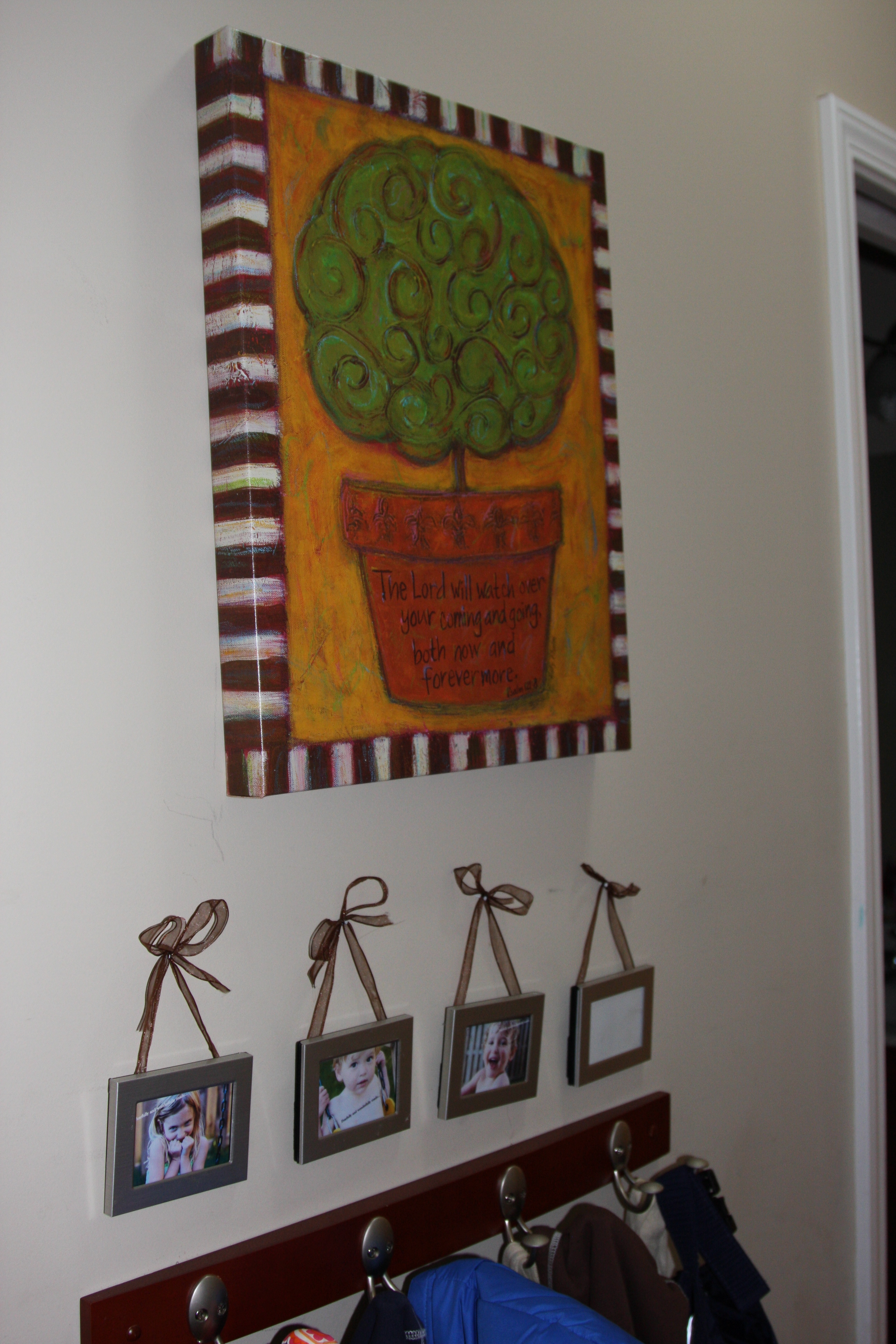 This stretched canvas print that hangs above the Snapp children’s coat hooks. The verse on the pot is Psalm 121:8: “The Lord will watch over your coming and going both now and forevermore”.